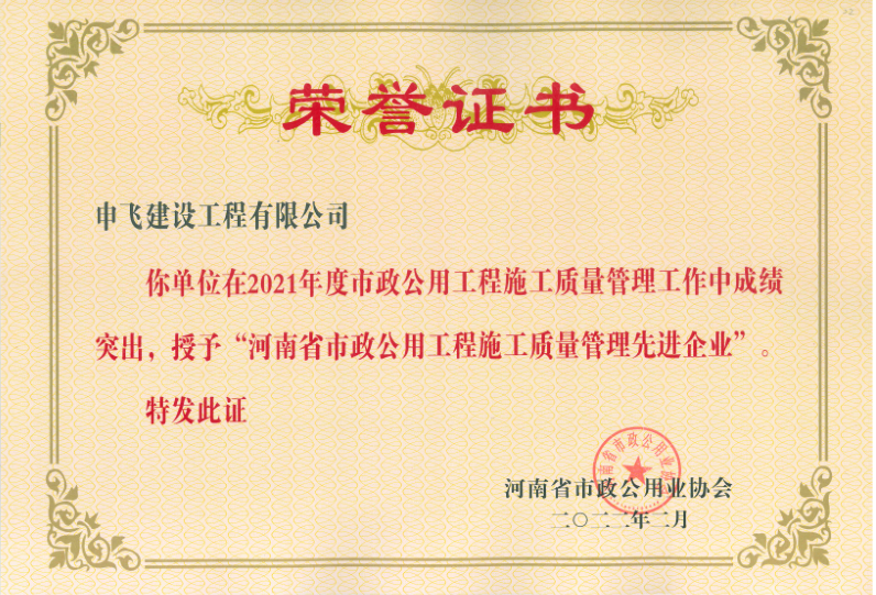 • [04-12]申飛建工再獲“省先進施工企業”、 “市政金杯獎”等多項榮譽